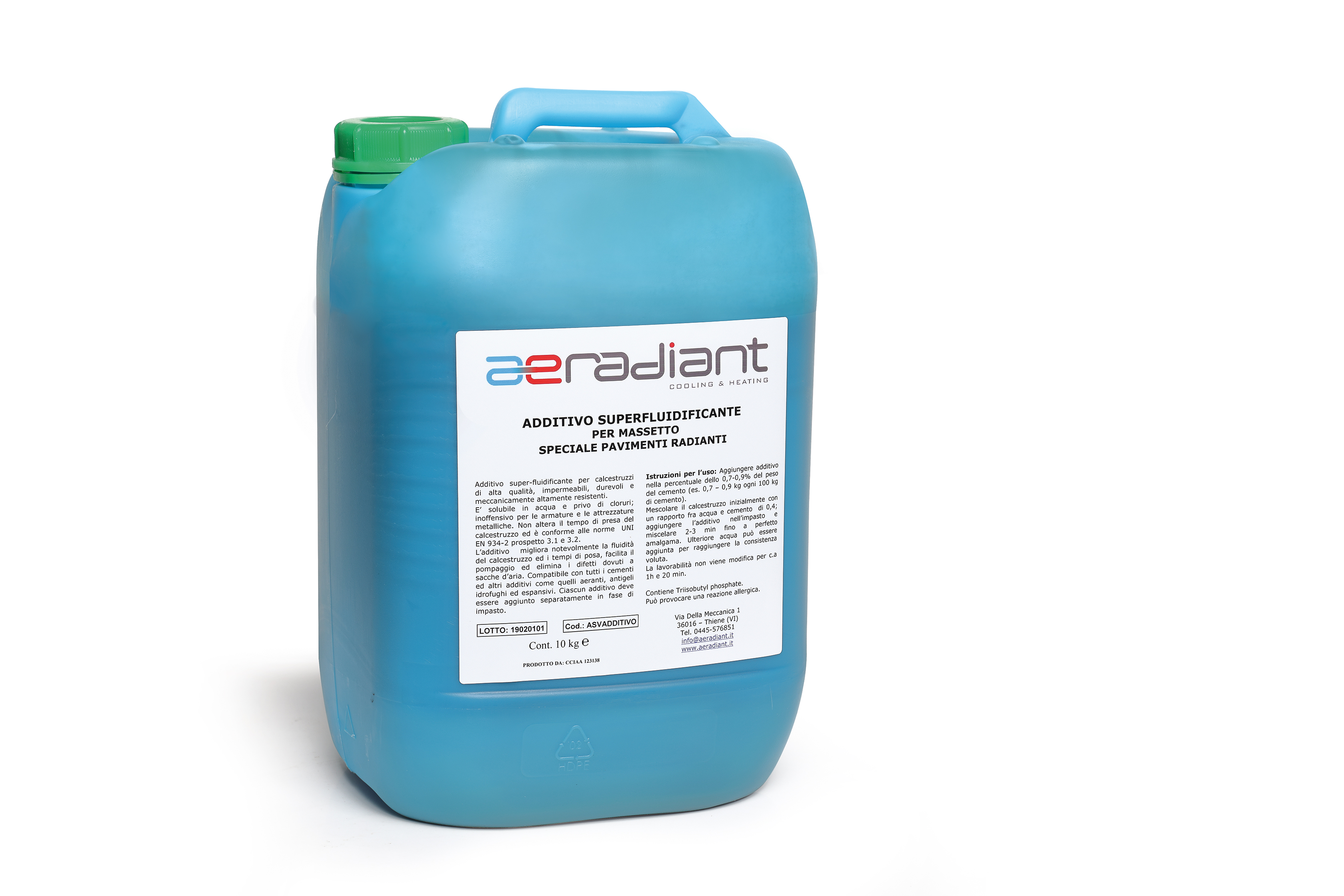 Additivo specifico per i massetti dei pavimenti radianti. È solubile in acqua e privo di cloruri, inoffensivo per le armature e le attrezzature metalliche. Non altera il tempo di presa del calcestruzzo ed è conforme alle norme UNI EN 934-2 prospetto 3.1 e 3.2. L’additivo migliora notevolmente la fluidità del calcestruzzo, ne riduce i tempi di posa, facilita il pompaggio ed elimina i difetti dovuti a sacche d’aria. Compatibile con tutti i cementi e con altri additivi come quelli aeranti, antigelo idrofughi ed espansivi. Ciascun additivo deve essere aggiunto separatamente in fase di impasto.