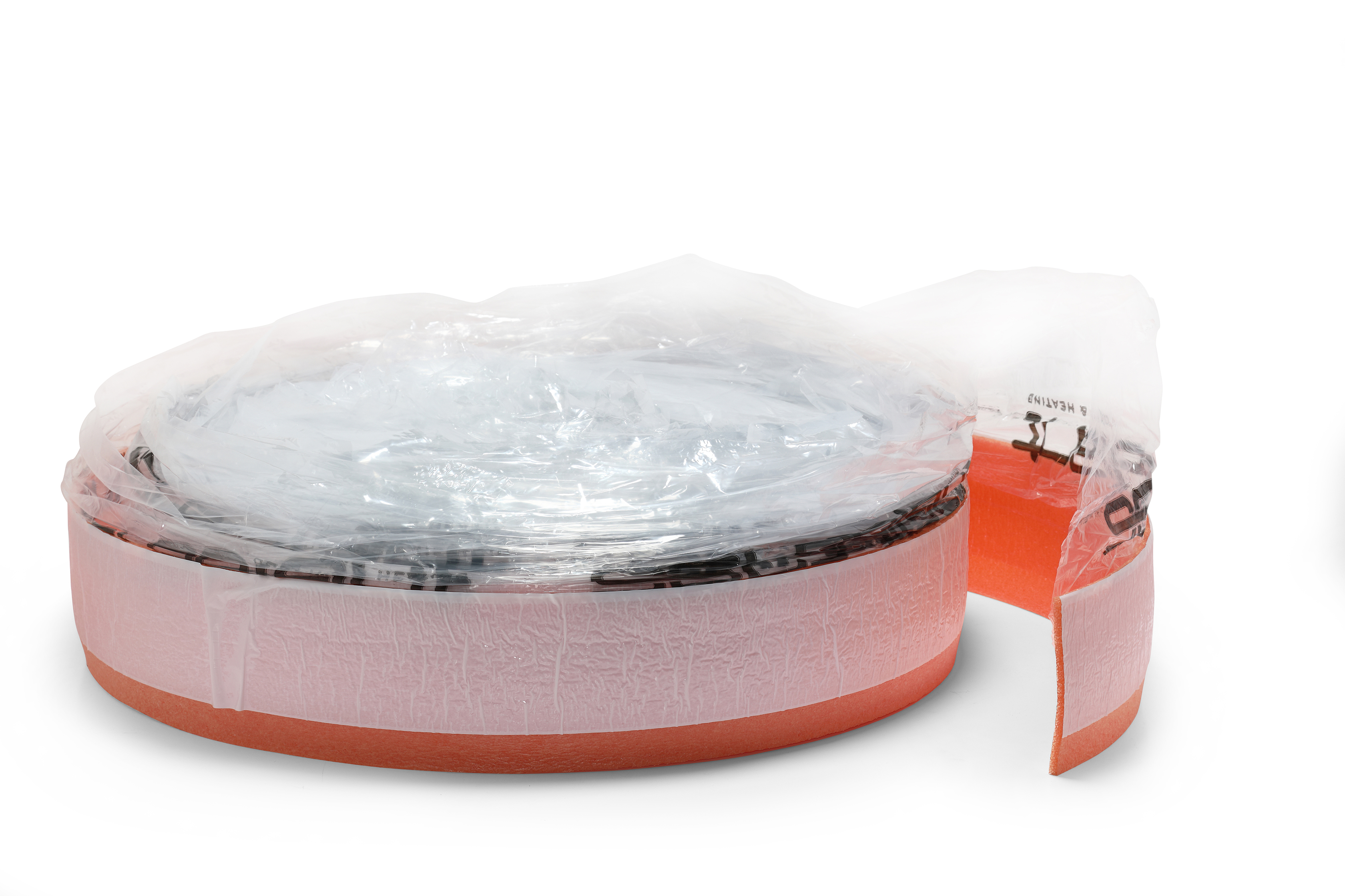 Striscia in polietilene espanso a cellule chiuse, fornito in rotoli di 50 m di lunghezza, altezza 130 mm con adesivo sul retro per 100 mm, e nylon da 300 mm da sovrapporre al pannello isolante. La striscia permette la dilatazione termica del massetto oltre a contribuire ad isolarlo termicamente e acusticamente dai muri perimetrali. Dopo l’asciugatura del massetto e la posa della pavimentazione viene tagliata l’altezza a misura.