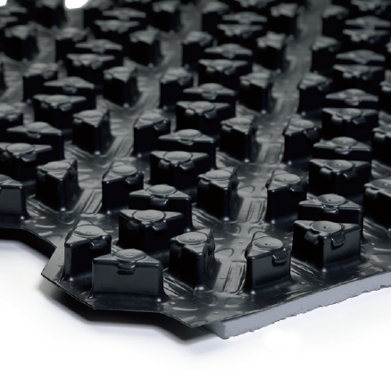 Il pannello è realizzato in polistirene espanso sinterizzato con grafite a celle chiuse ad alta densità (50 kg/mc), accoppiato con un guscio in polistirene laminato termoformato HIPS 650 μm con la funzione di barriera al vapore. I bordi del guscio eccedono il bordo del pannello di 50 mm per essere congiunti ad incastro al pannello adiacente e per garantire l’assenza di interruzioni (estremamente importante dato il massetto super fluido). Il pannello ed il guscio hanno bugne in rilievo di 15 mm pedonabili, progettate per accogliere tubo ø14 mm. Il tubo viene facilmente incastrato fra le bugne che lo tengono in posizione in base al passo di posa scelto (5, 10, 15 e 20 cm).