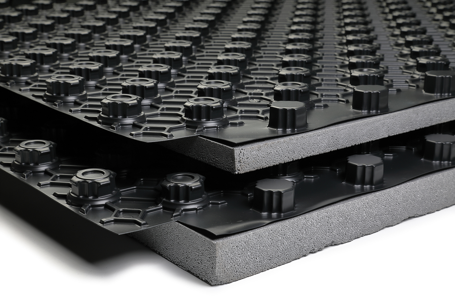 Pannello termoformato e termoacustico realizzato a doppia densità in polistirene espanso sinterizzato (EPS150) e EPS120 con grafite. La presenza di due strati di differente densità migliora la prestazione acustica perché il rumore da calpestio si abbatte nel passaggio da uno strato all’altro (da 21 a 27 dB in meno). Tutta la superficie è rivestita da uno strato removibile in materiale plastico, termoformato, rigido e di colore nero che ricopre ogni bugna fungendo da barriera vapore a protezione dell’isolante dall’umidità del getto come previsto dalla normativa UNI EN 1264-4. I bordi della barriera vapore eccedono il bordo del pannello per essere sormontati dal pannello adiacente, garantire l’assenza di interruzioni e garantire maggiore stabilità.
