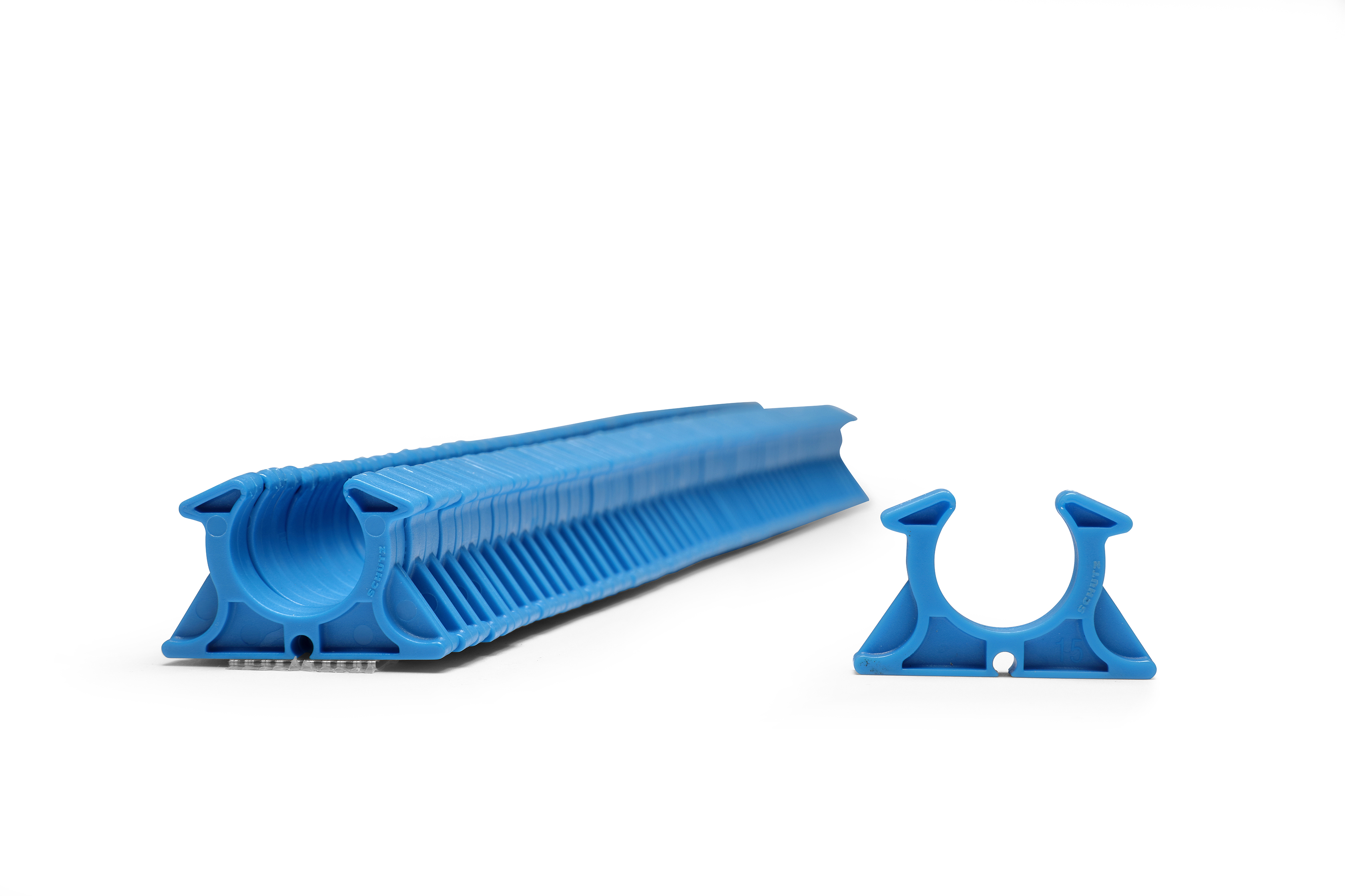 Clips TOP realizzate in poliammide per il fissaggio automatico della tubazione Pe-Xa 17x2 alla rete elettrosaldata. Vengono applicate mediante l’apposito strumento clippatore sulla rete e fornite in caricatori da 50 pz. Grazie alla loro particolare conformazione, l’inserimento del tubo spinge la clip ad aprirsi nella parte superiore rinsaldando l’aggancio alla rete nella parte inferiore della clip stessa.