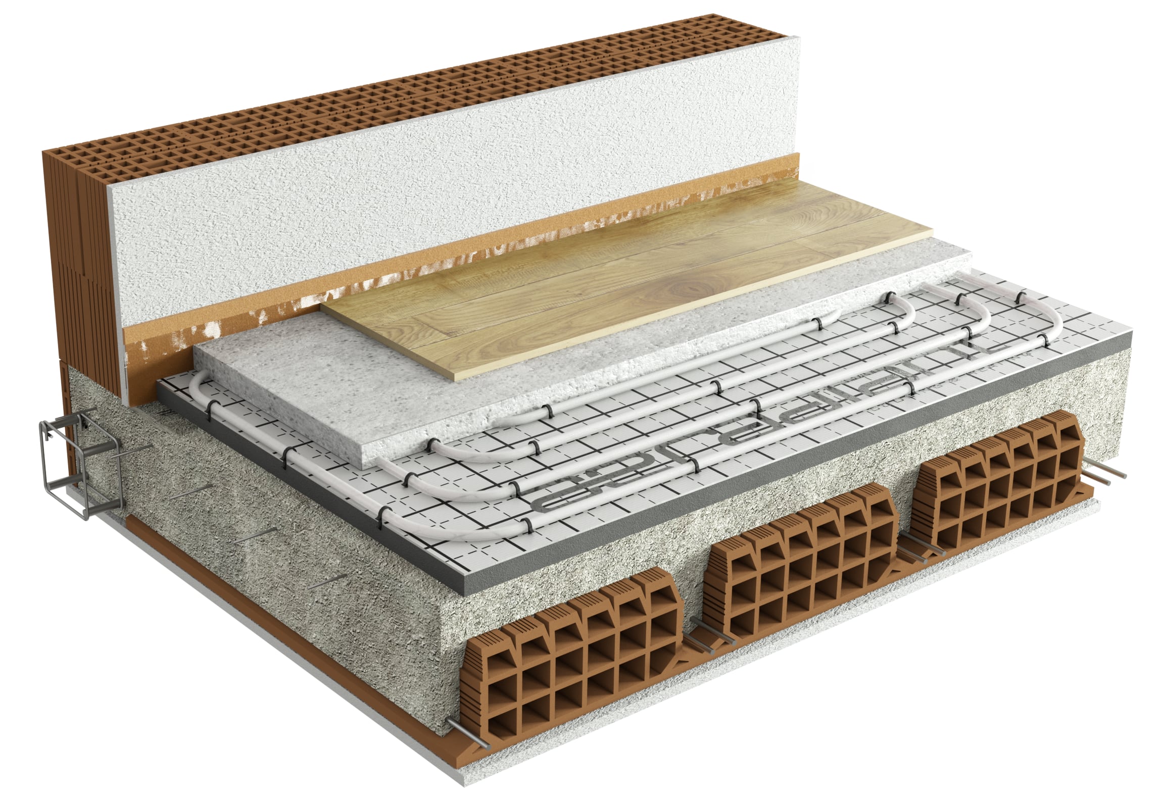 UNI EN 1264-4 e DIN 18560-2. (Con i massetti speciali lo spessore può diminuire secondo le nostre indicazioni) B Spessore tubo e clip 20 mm (tubo 17 mm e clip 3 mm)